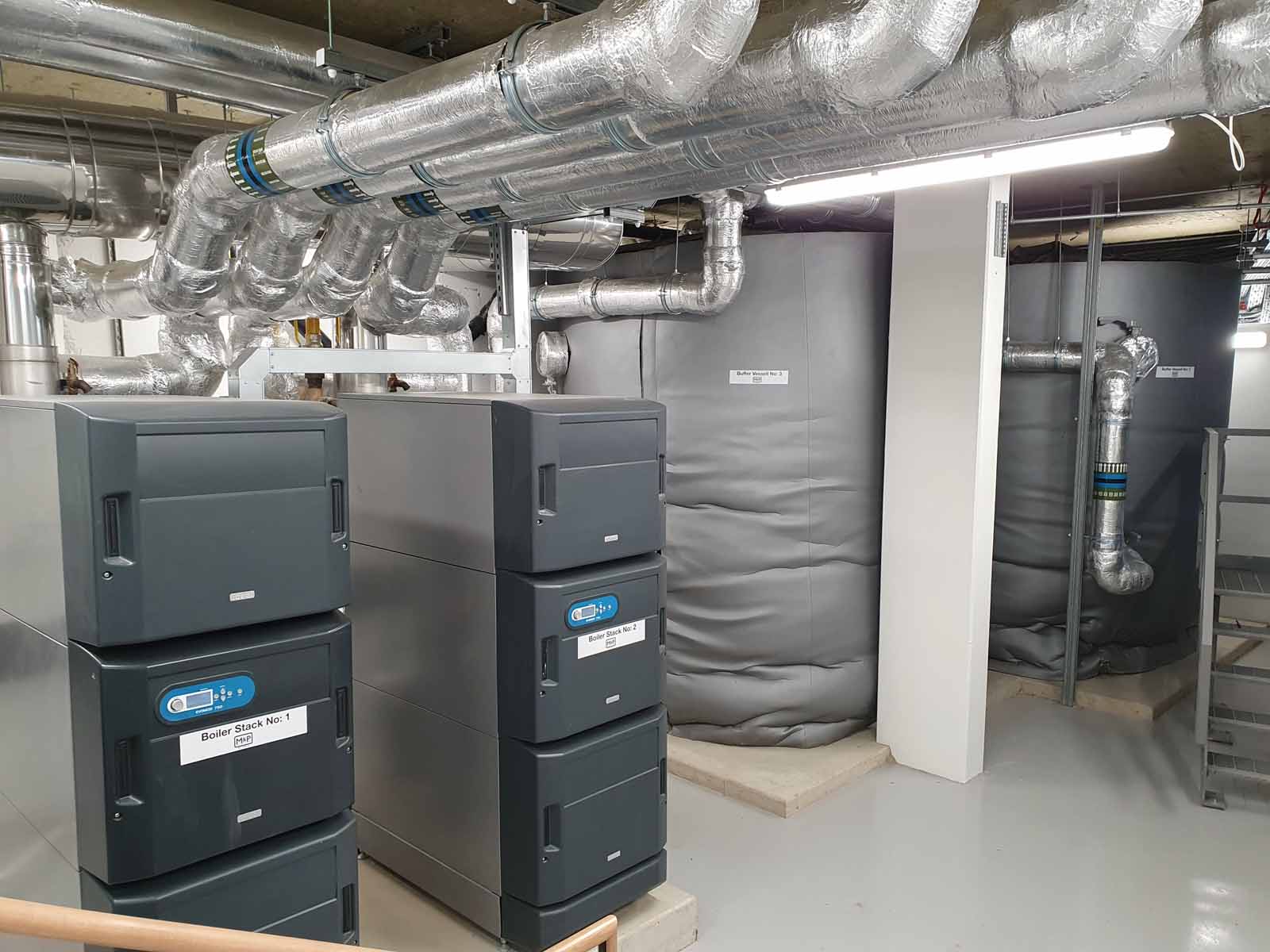 Back up gas boiler stacks and buffer vessel