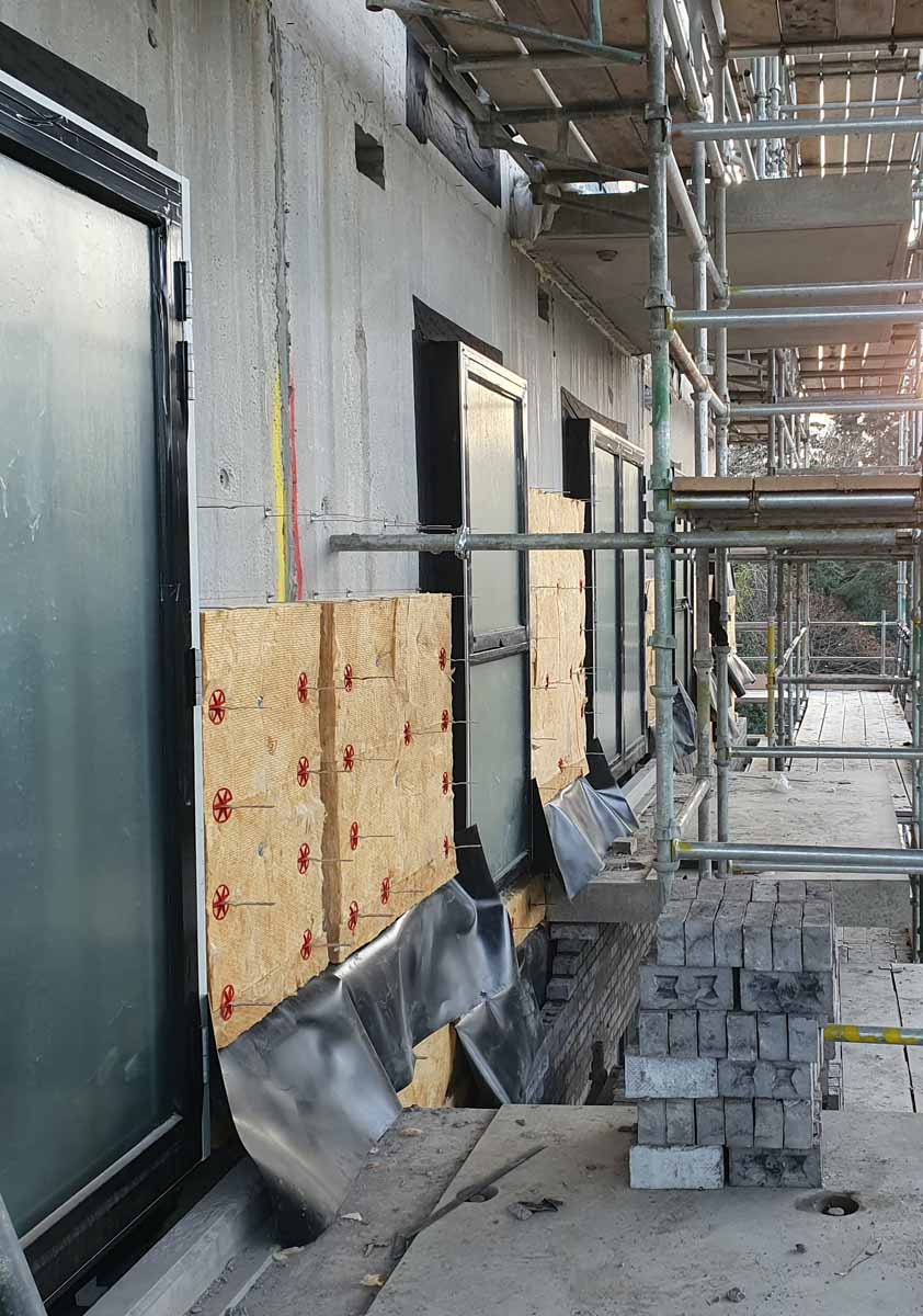 Airtight taped triple glazed NorDan windows sit proud of the blockwork to ensure continuity with the Isover insulation layer