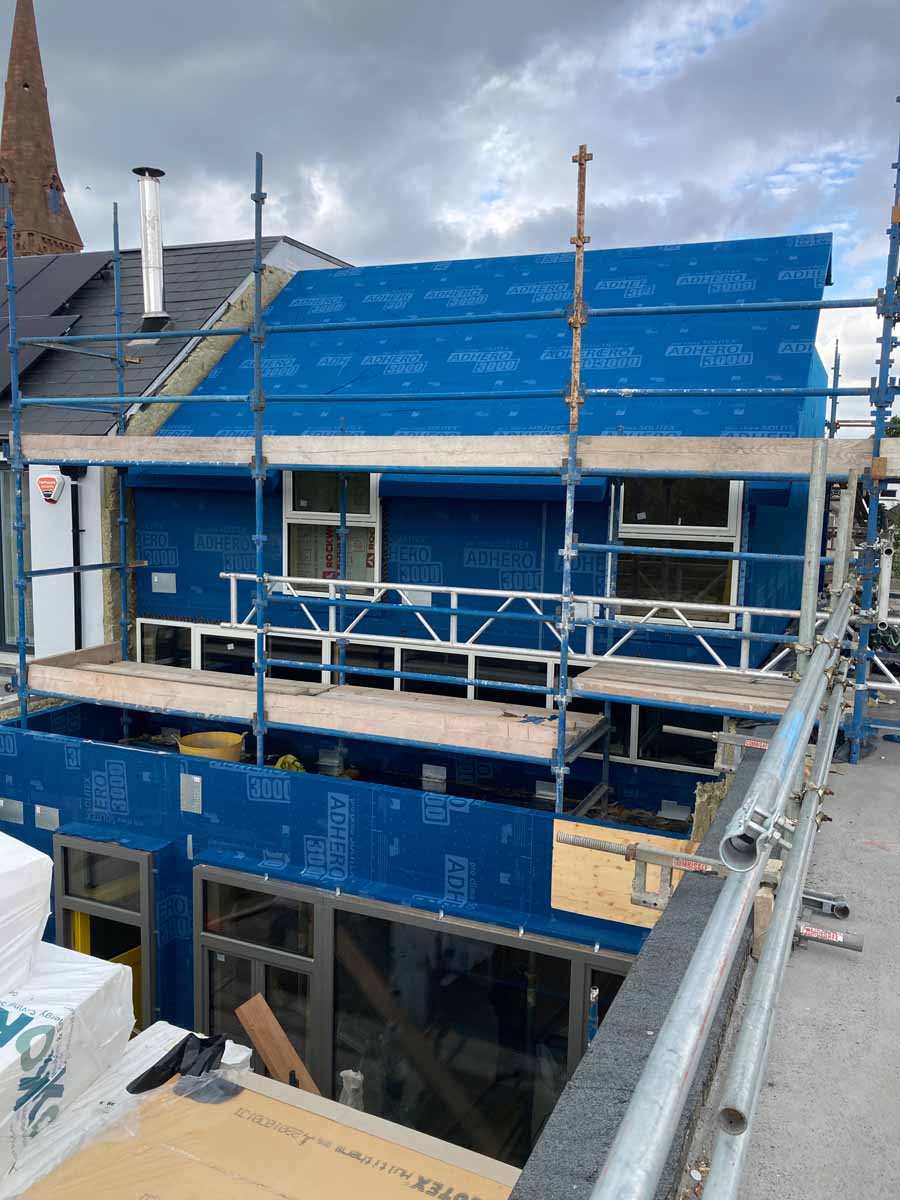 View of windows to front mounted forward of CLT in external insulation zone on Bosig structural board below