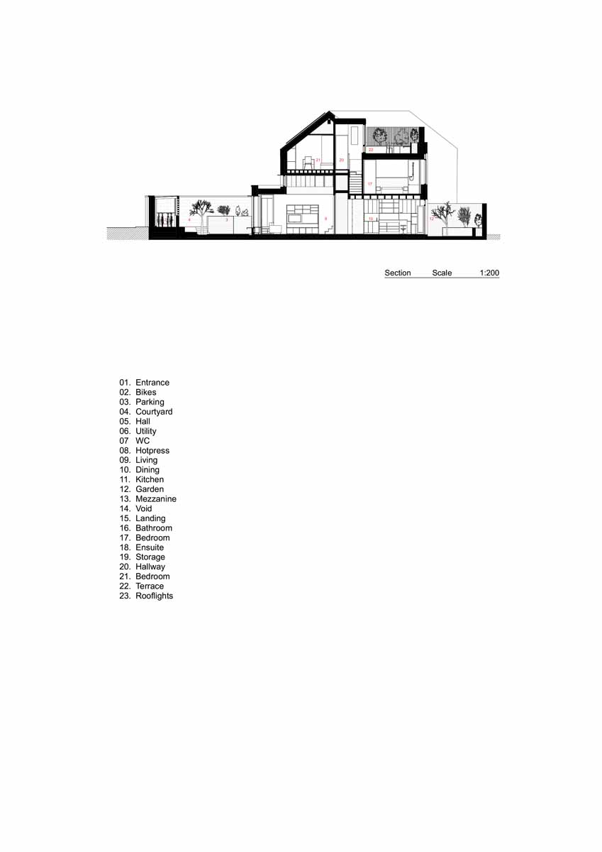 Ventilation: 2 x Passive House Institute-certified decentralized heat recovery unit. Brick enclosing walls to staircase and ceramic plank ceiling to kitchen and dining room with concrete topping designed to absorb heat and avoid overheating. Window incorporated at the very highest point of the house in the central staircase to encourage natural ventilation outside of heating season.