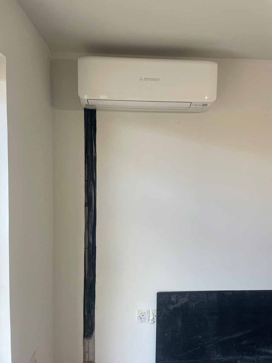 The heat pump indoor unit with warm and cold refrigerant pipes running to it