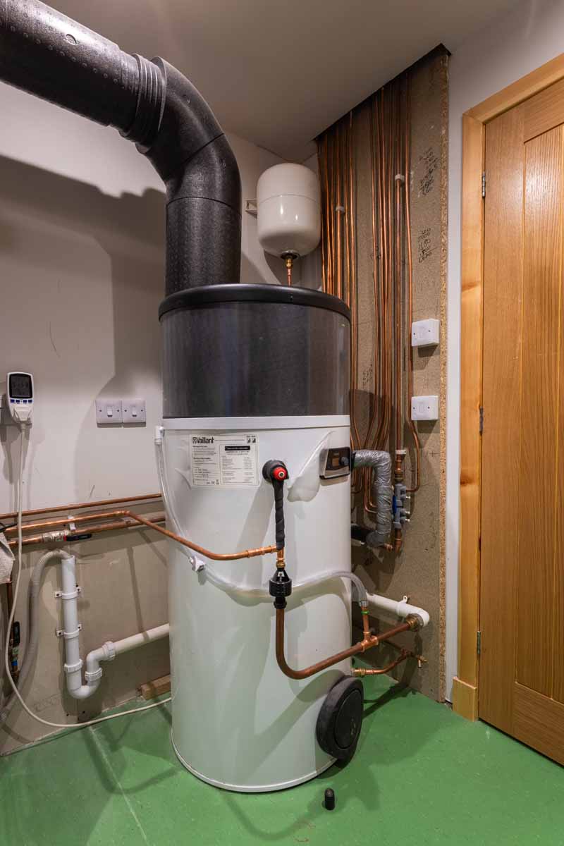 For hot water we went for a hot water heat pump – an insulated hot water cylinder with a small heat pump sitting on top. Typically, these are ducted to the outside and use outside air as their heat source, but we have ended up using the indoor air as our heat source. This decision also came about serendipitously – I had cored the holes for our MVHR supply and exhaust ducts in our concrete blockwork walls and my shoulders were keen that I didn’t do any more of this sort of work unless absolutely necessary. I decided there were potentially some other advantages to having the hot water heat pump stealing heat from the house and that we’d run the house for a trial period like this – I could always core some more holes if it didn’t work well. A centrally located hot water cylinder with radial 10 mm copper pipework minimizes distribution heat loss and provides quick hot water delivery due to low pipe volume, though it requires good mains pressure.