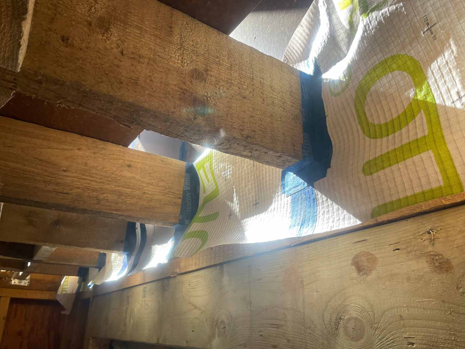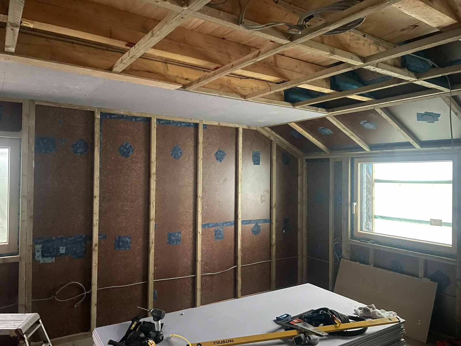 Finsa Vapourstop board serves as AVCL in the first floor. Note tapes over drill holes for cellulose insulation.