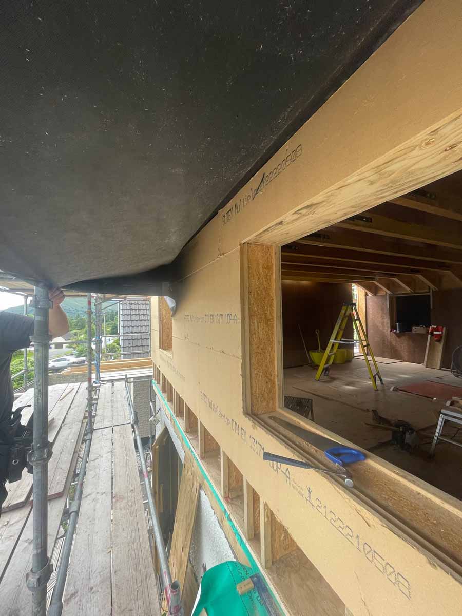 Sealing the edge of the window cills to keep wind and water tight before cladding goes on