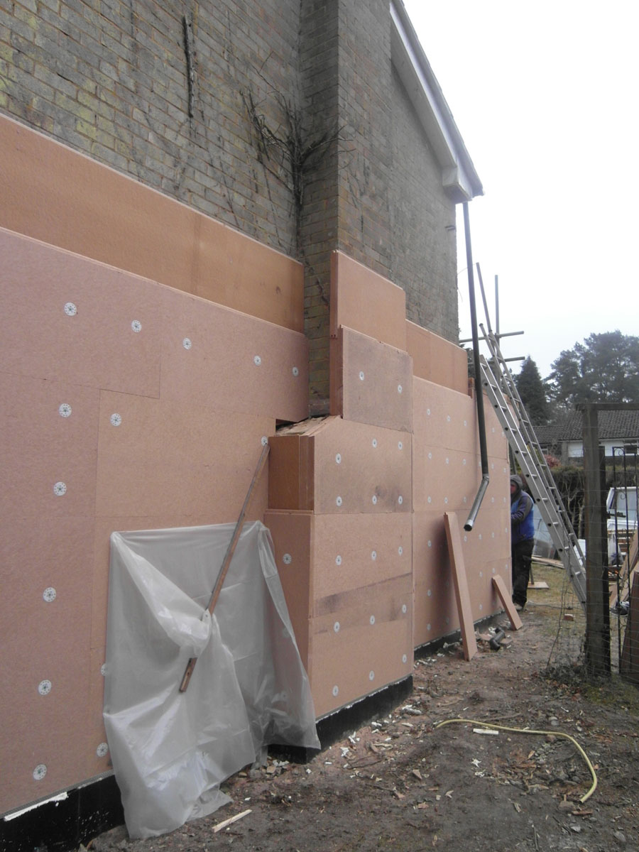After: Crosswalls upgraded externally with 100mm Steico Protect wood fibre boards under lime render. U-value: 0.247 W/m2K